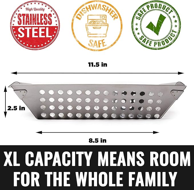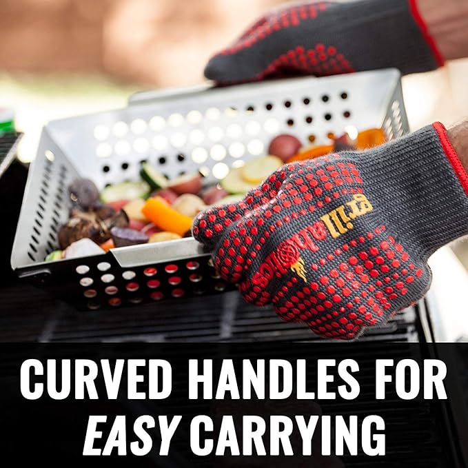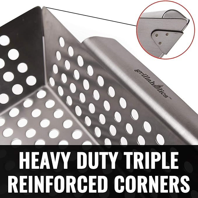 - HEAVY-DUTY DESIGN - Built to outlast the competition, our vegetable grill basket is crafted from heavy-duty, thick-gauge, food-grade stainless steel. Featuring triple-reinforced corner brackets, it can withstand intense heat and will be your trusted grilling companion for years. No more dealing with cheap, flimsy alternatives that warp and bend, or nonstick grill baskets that flake and peel under high heat!