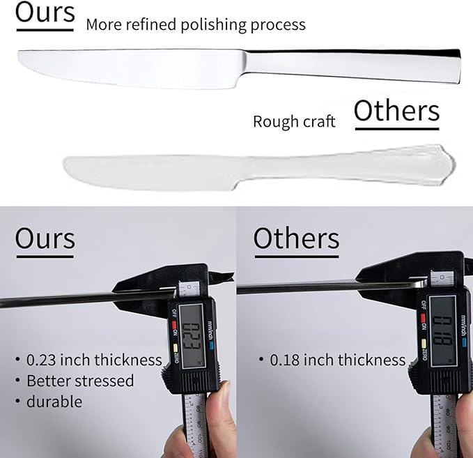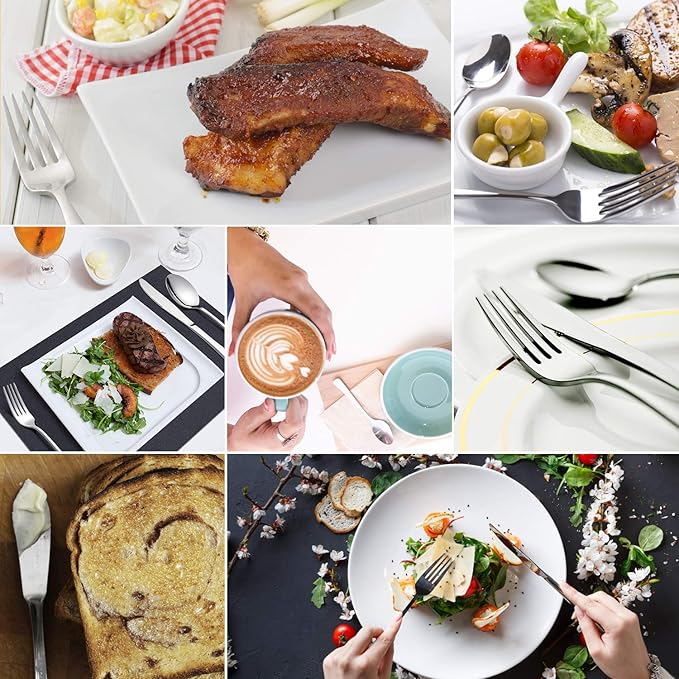 - Luxury and Lustrous Design: Unique yet extraordinary, this versatile stainless flatware cutlery set features a gleaming mirror polish which requires no repolishing. Elegant design and superior quality makes this silverware set spoons and forks set suitable for kitchens,restaurants, events, and everyday meals