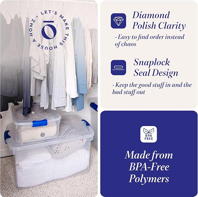 HOMZ 4-Pack Latching Lid, Large Clear Plastic Storage Bins with Lids, 31 Quart, Blue Latch - Stackable Container Boxes for Home, Bathroom, and Office Organization