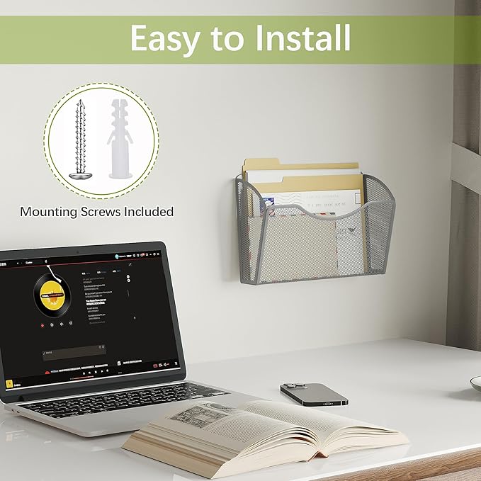 EasyPAG Wall File Holder, Single Mesh Hanging File Organizer for A4 Letter Size Paper, Wall Mount Paperwork Basket for Office, Home, School, Silver