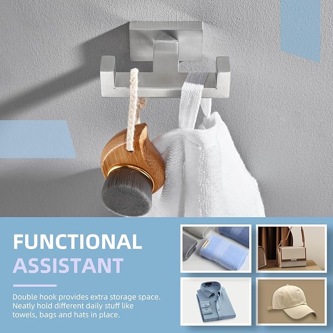 - CONVENIENT SPACE SAVER: modern double hook neatly holds bath towels, bathrobes, coats, handbags, sponges or other stuff for easy access and space saving, no more buying multiple individual hooks to hang items.