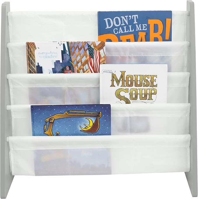 Humble Crew 4-Tier Kids Bookshelf, Grey Wood/White - Premium Book Shelf for Kids Rooms with Four Deep Pockets - Toddler Sling Book Rack with Deep Sleeves, Nursery Bookcase Organizer