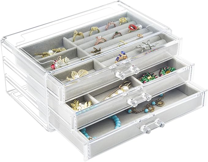 Acrylic Jewelry Box 3 Drawers, Velvet Jewellery Organizer, Earring Rings Necklaces Bracelets Display Case Gift for Women, Girls