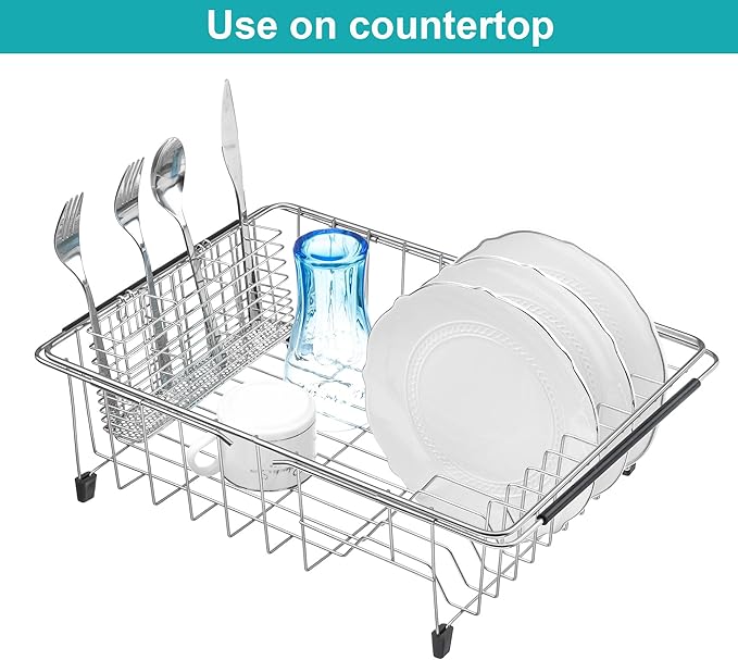 - ✔ 3-in-1 FUNCTION: This in sink dish drying rack expands for use on the counter, in the sink or over the sink. Non slip extendable rubber arms and feet protects the counter and sink from scratches.