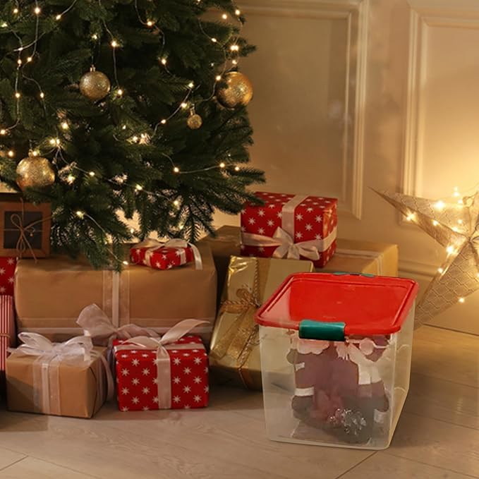 HOMZ 4-Pack Holiday Tote, Plastic Storage Organizer Bins with Lids, 31 Quart, Clear/Red - Stackable Organizing Containers for Home, Garage, and Office