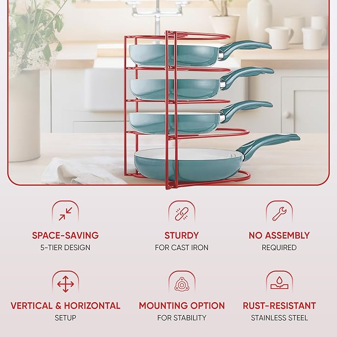 Heavy-Duty Pots and Pans Organizer | 5-Tier Cookware & Lid Storage Rack | Free-Standing or Wall-Mount | Kitchen Organizer for Cast Iron Skillets, Pots, Frying Pans, Lids | Red