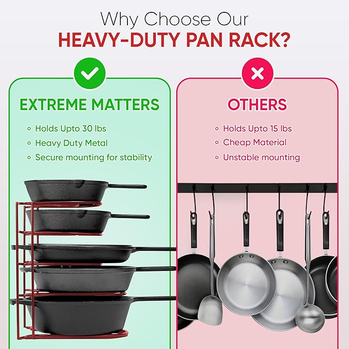 - STURDY & DURABLE: This heavy-duty Kitchen Storage Pot Rack Organizer is made from high-quality, metal, capable of holding up to 6.6 lbs per shelf. Perfect for storing Cast Iron Skillets, Pots, Frying Pans, and Lids, this rack offers maximum stability, especially for heavy cookware like cast iron pans. Mounting hardware is included for added stability when needed.