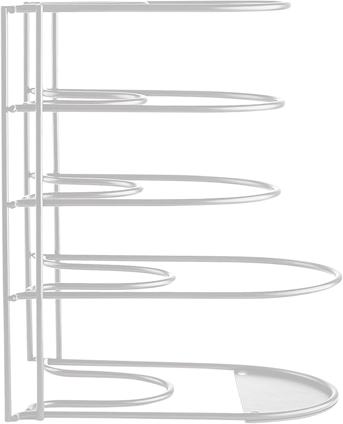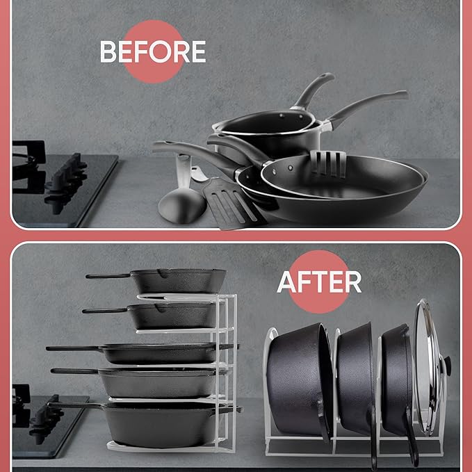 - EFFICIENT STORAGE: Designed to accommodate various cookware sizes, this cooking pan organizer features five shelves with ample space between each to hold your pots, pans, baking pan, and lids. The first four shelves offer 2.5 inches of clearance, while the bottom shelf offers 3.5 inches, making it ideal for larger items. This organizer works perfectly as an inside cabinet pan organizer or a pan organizer under a cabinet, helping you maximize space and keep your kitchen clutter-free.