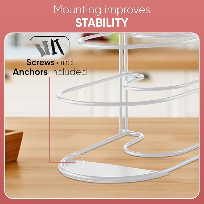 - FREE-STANDING OR WALL-MOUNTABLE: Use the rack as a free-standing pan organizer or mount it to your kitchen wall for additional stability. The mounting hardware is included, making this a versatile solution for your kitchen storage needs. Ideal for use as a kitchen counter organizer or pot rack organizer for cabinets.