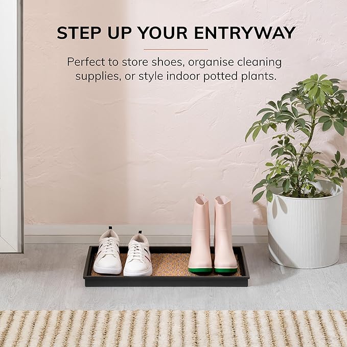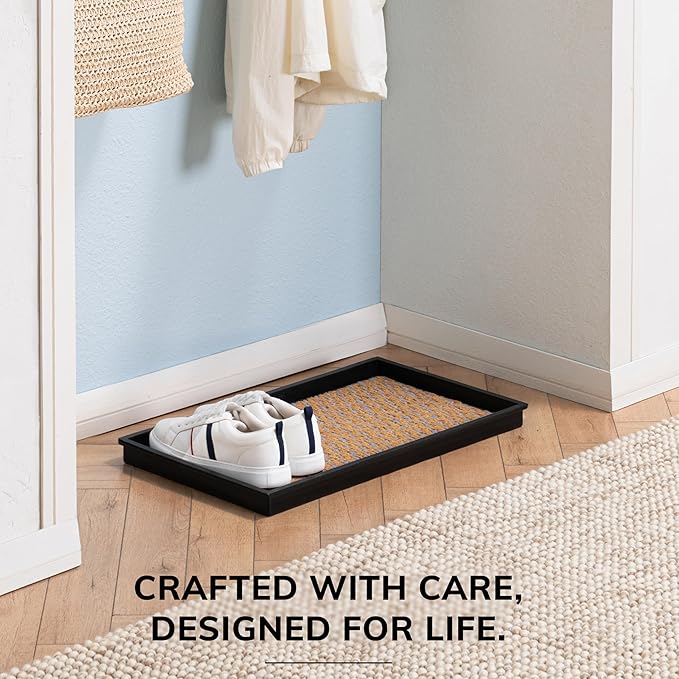 - Made using 100% Woven Coir: This rubber boot tray is meticulously crafted using 100% woven coir (coconut fiber), offering a sustainable and durable solution for your home. The natural fibers of coir are renowned for their toughness and ability to withstand daily wear and tear, ensuring that this boot tray for entryway remains a functional and eco-friendly addition for years to come.