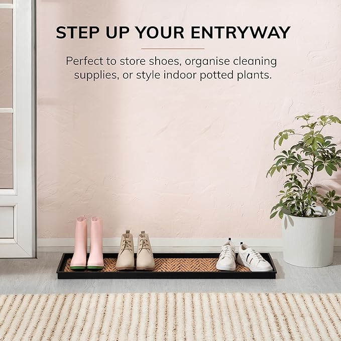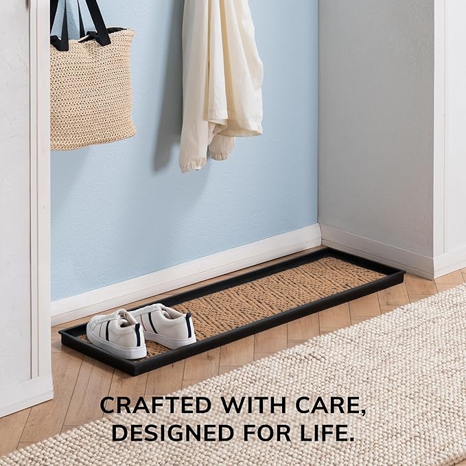 - Made using 100% Woven Coir: This rubber boot tray is meticulously crafted using 100% woven coir (coconut fiber), offering a sustainable and durable solution for your home. The natural fibers of coir are renowned for their toughness and ability to withstand daily wear and tear, ensuring that this boot tray for entryway remains a functional and eco-friendly addition for years to come.