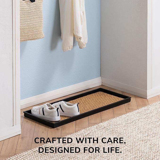 - Made using 100% Woven Coir: This rubber boot tray is meticulously crafted using 100% woven coir (coconut fiber), offering a sustainable and durable solution for your home. The natural fibers of coir are renowned for their toughness and ability to withstand daily wear and tear, ensuring that this boot tray for entryway remains a functional and eco-friendly addition for years to come.