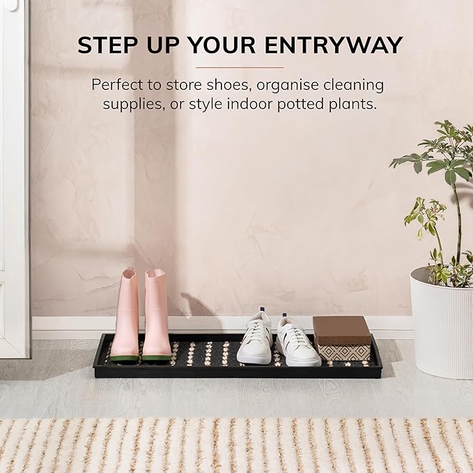 - Made using 100% Woven Coir: This rubber boot tray is meticulously crafted using 100% woven coir (coconut fiber), offering a sustainable and durable solution for your home. The natural fibers of coir are renowned for their toughness and ability to withstand daily wear and tear, ensuring that this boot tray for entryway remains a functional and eco-friendly addition for years to come.