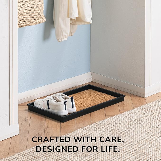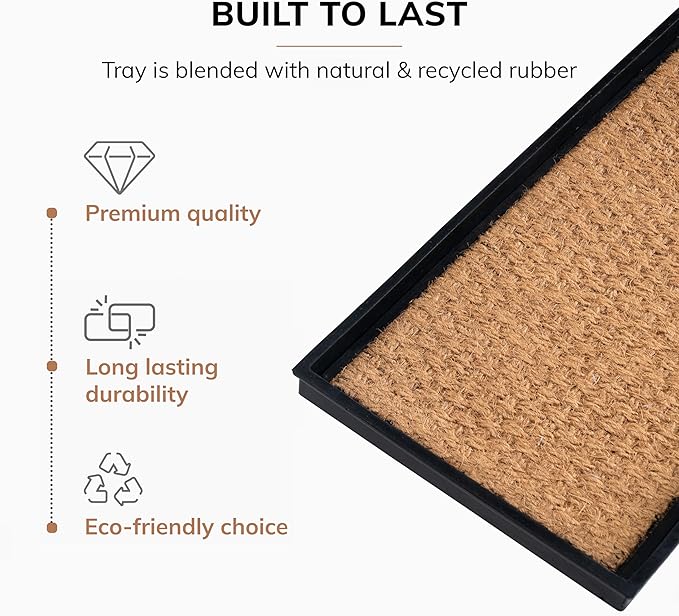 - Made using 100% Woven Coir: This rubber boot tray is meticulously crafted using 100% woven coir (coconut fiber), offering a sustainable and durable solution for your home. The natural fibers of coir are renowned for their toughness and ability to withstand daily wear and tear, ensuring that this boot tray for entryway remains a functional and eco-friendly addition for years to come.