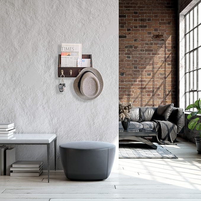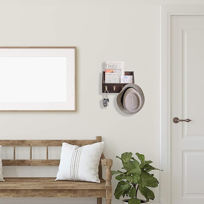 Flintar Wall Mount Key and Mail Holder with 4 Hooks. Made in Taiwan, Solid Wood. Use as Key Rack, Entryway or Mudroom Organizer, Mail & Bill Sorter, Magazine Holder (Walnut)