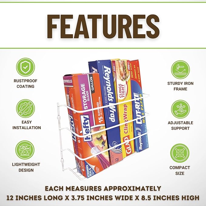 - SPACE SAVER: This set of 2 kitchen organizers will maximize your kitchen accessories storage space. These mountable shelves help you store wax paper, aluminum foil, saran wrap, zip & garbage bags, paper bags, food wraps. Perfect baking & pantry organization and storage of coffee, candy, chips, tea, sugar & snack. Sold on Amazon for over 5 years