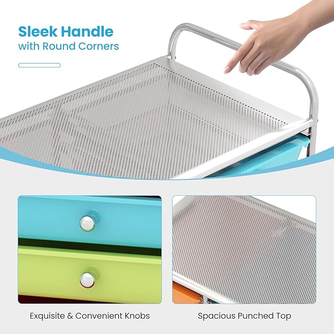 - [User-Friendly Design]: The top of this rolling storage cart is spacious enough to offer additional storage space. Besides, two side handles are easily hold for you to move the cart. Chrome knob makes it easy for pulling out drawers. With elaborate instruction, the assembly work of cart frame and knobs will take you short time.
