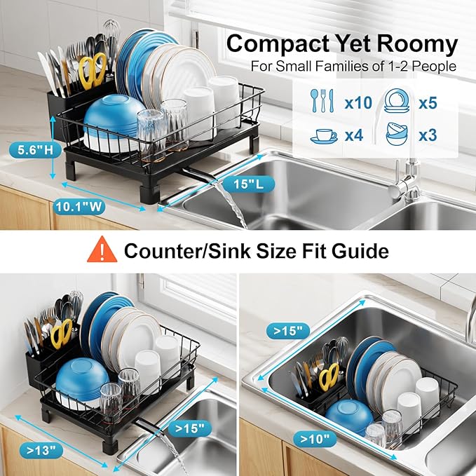 - Perfect Size for Small Kitchens: Say goodbye to cluttered counters! The GSlife compact dish drying rack (15.0"L x 10.1"W x 5.6"H) fits perfectly on your kitchen countertop or inside sink, ideal for small spaces like apartments and RVs. It neatly holds up to six 11-inch plates, cups, bowls, and utensils