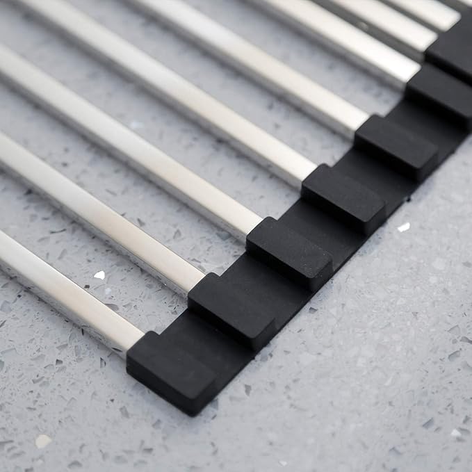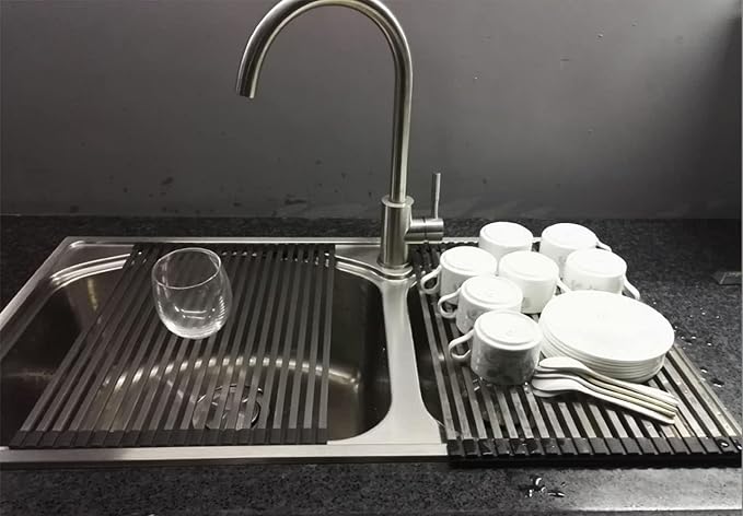 - Spacing-saving Dish Drying Mat: This dish drainer can roll up and go in a drawer quickly when not in use. Works great and keeps the kitchen sink area looking neat, the best one of dish drainers for kitchen counter. You can roll up this sink dish drying rack as much as you like during using it and for the pipes also can be removable