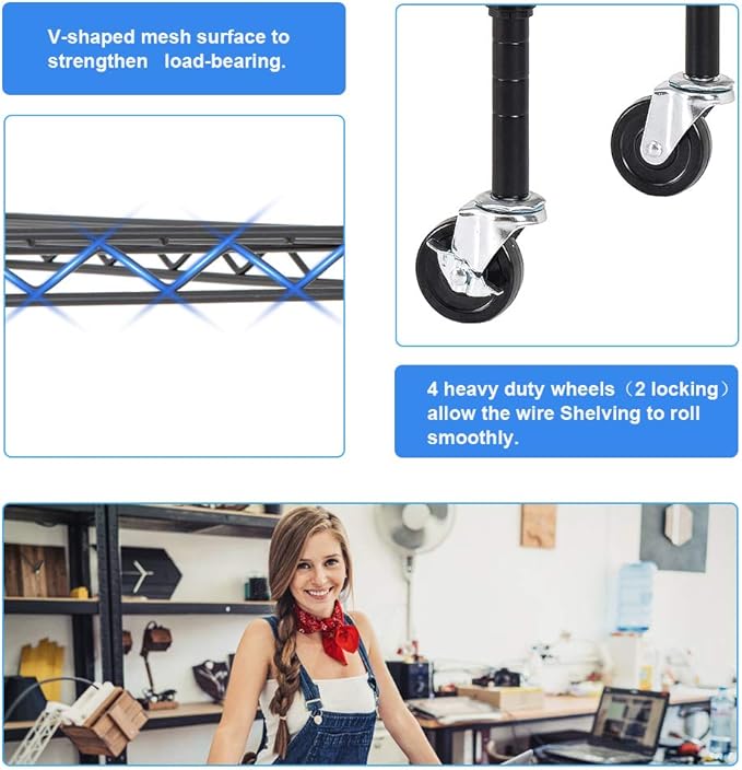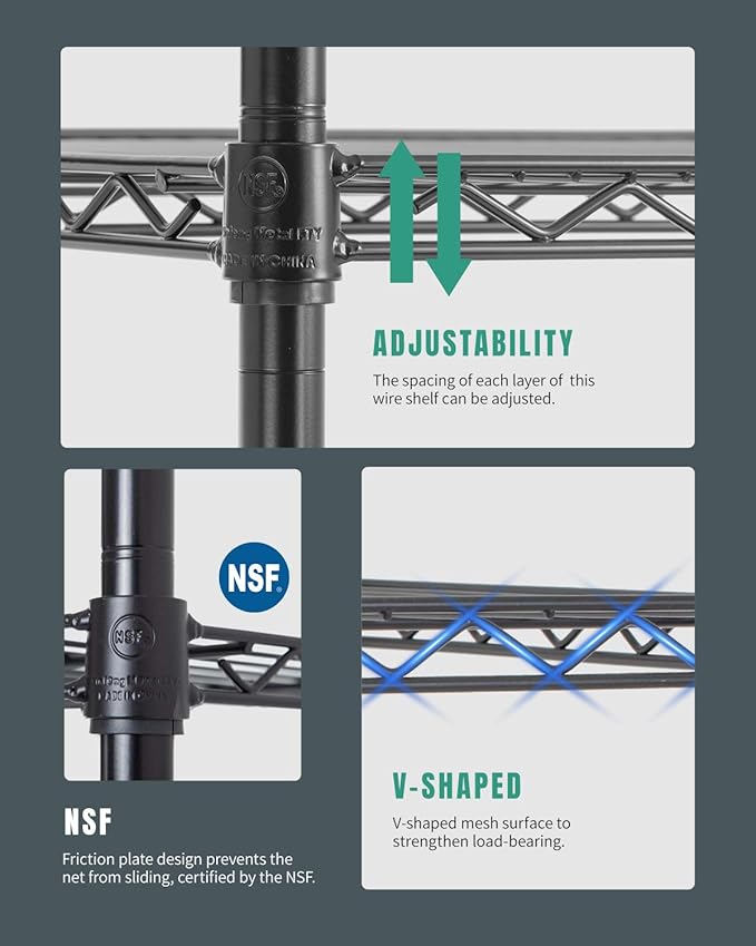 - ADJUSTABLE DESIGN FOR FLEXIBILITY: Customize shelf spacing to fit tall, bulky, or oddly shaped items, perfect for adapting your wire shelf to evolving storage and organization needs.