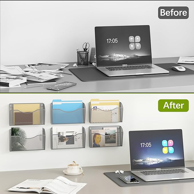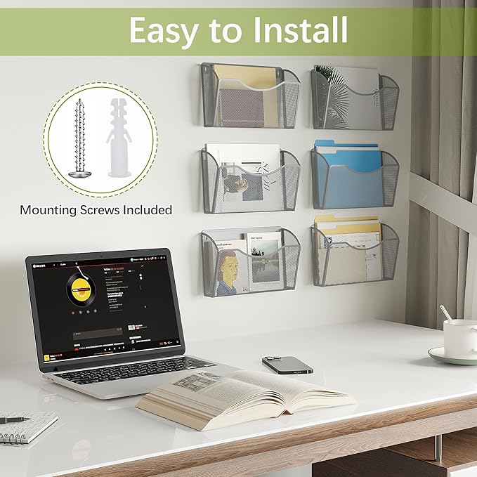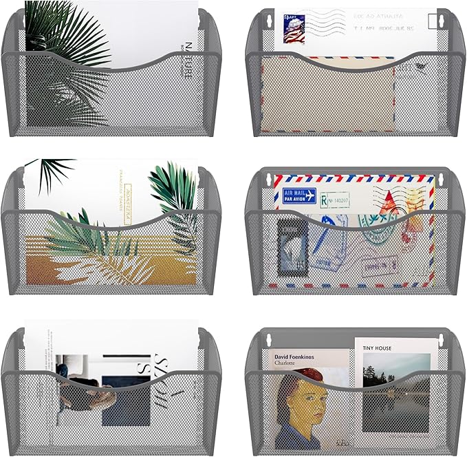 EasyPAG 6 Pack Wall File Holder, Single Mesh Hanging File Organizer for A4 Letter Size Paper, Wall Mount Paperwork Basket for Office, Home, School, Silver