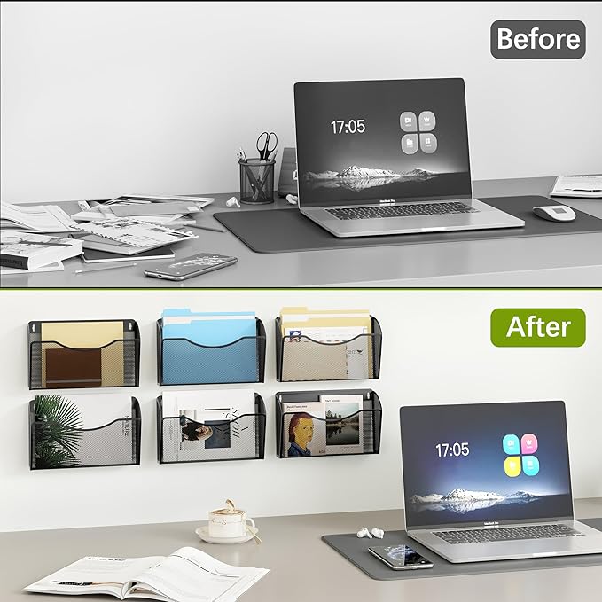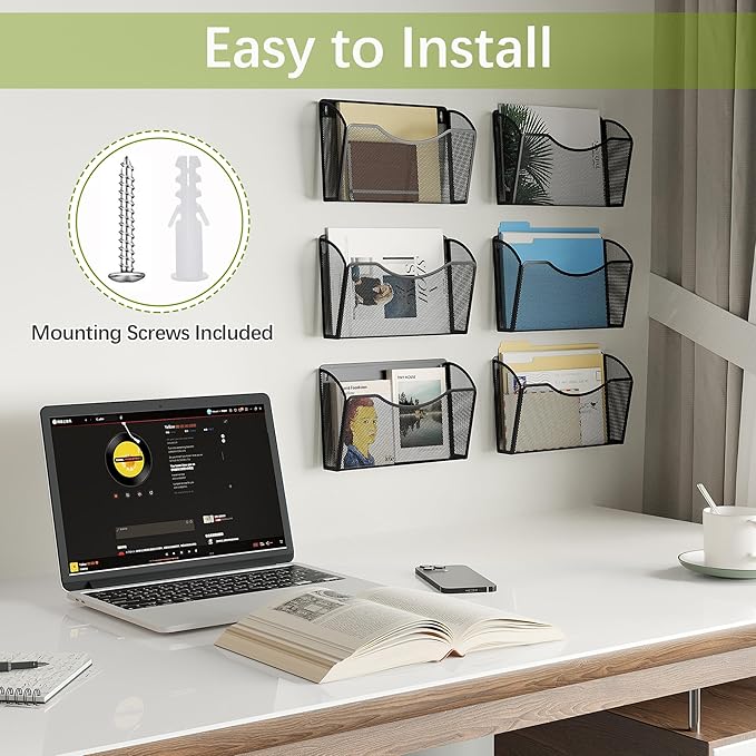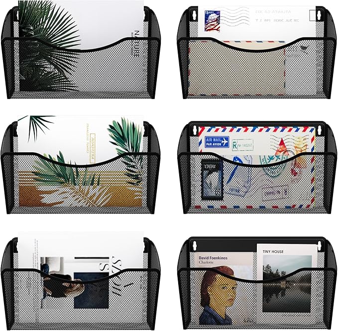 EasyPAG 6 Pack Wall File Holder, Single Mesh Hanging File Organizer for A4 Letter Size Paper, Wall Mount Paperwork Basket for Office, Home, School, Black