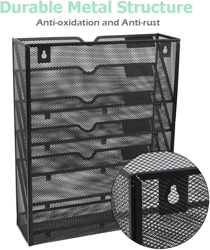 EASEPRES Desk File Organizer Mesh 6-Tier, Hanging Wall Mount Document Organization Stand, Desktop Vertical Mail Paper Folder Holder Rack with Bottom Tray for Office Home Cubicle, Sides Closed, Black
