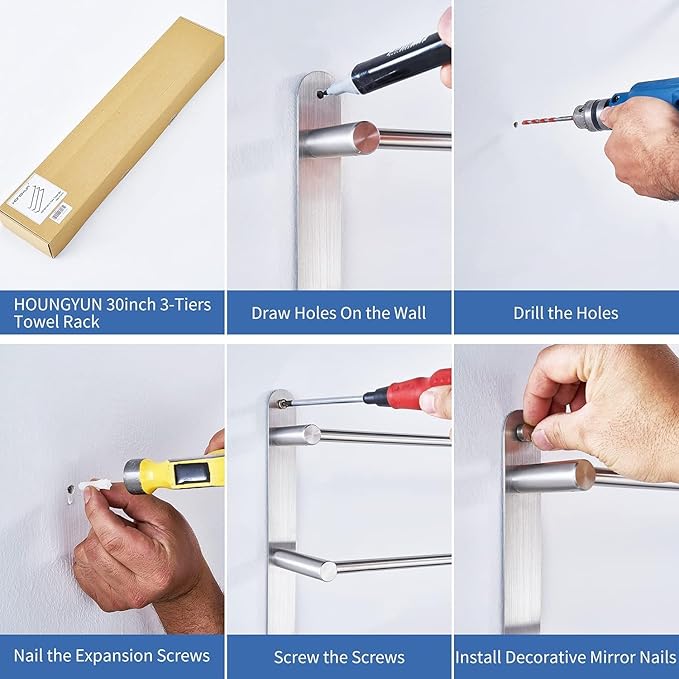 - To Install: The towel shelf wall mounted contains a full set of accessories screw hardware and can be easily installed in a few simple steps. Screw fixed, no need to worry about load bearing.Both adhesive and drilling mounting is available. Adhesive mounting will not damage the wall, but is also not suitable for drywall.