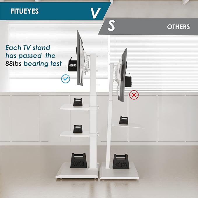 - TV Stand for 32 to 75 Inch TVs: FITUEYES universal TV stand with mount is compatible with most 32 37 43 46 50 55 60 65 75 inch plasma LCD LED OLED Plasma Flat Panel or Curved Screen TVs. Please make sure your TV’s VESA mounting holes fall between 100(w)x100(h) to 600(w)x400(h) mm