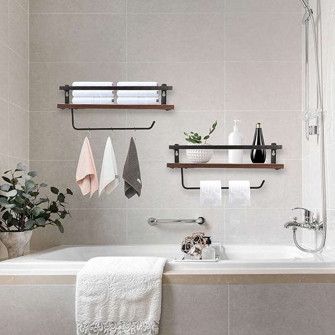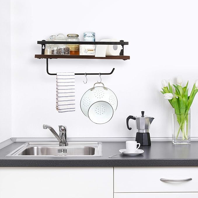 - 【Paper Towel Holder and Removable Hooks】the 17inch wall mounted floating shelves with hooks save a large space for corner storage and give you a clear counter. Provided all needed screws and the instructions, easy to install.2 tier enough to help you to organize the cups,scoop and other kitchen products.