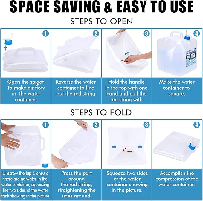 - Outdoor Use: As a storm such as a hurricane approaches, You can easily be ready to store all the water your family needs at a moment's notice, without taking up space in those bulky water containers. This collapsible water container is Space-saving by more than 80%, it is perfect for outdoor camping, hiking, fishing, and car travel. This is a good practice, although carrying a bottle takes up too much space that could be used to bring other necessities to your camping.