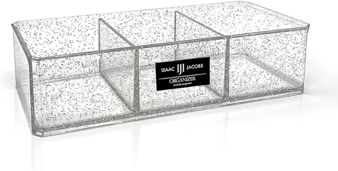 Isaac Jacobs Clear Acrylic 3 Section Organizer- Three Compartment Drawer Tray and Storage Solution for Office, Bathroom, Kitchen, Supplies, and More (Silver Glitter)