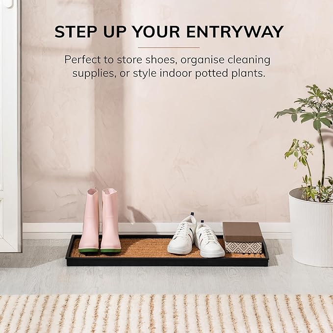 - Made using 100% Woven Coir: This rubber boot tray is meticulously crafted using 100% woven coir (coconut fiber), offering a sustainable and durable solution for your home. The natural fibers of coir are renowned for their toughness and ability to withstand daily wear and tear, ensuring that this boot tray for entryway remains a functional and eco-friendly addition for years to come.