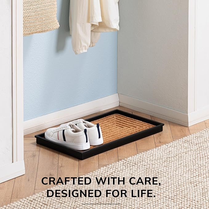 - Made using 100% Woven Coir: This rubber boot tray is meticulously crafted using 100% woven coir (coconut fiber), offering a sustainable and durable solution for your home. The natural fibers of coir are renowned for their toughness and ability to withstand daily wear and tear, ensuring that this boot tray for entryway remains a functional and eco-friendly addition for years to come.