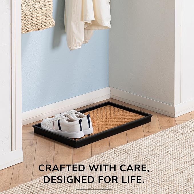 - Made using 100% Woven Coir: This rubber boot tray is meticulously crafted using 100% woven coir (coconut fiber), offering a sustainable and durable solution for your home. The natural fibers of coir are renowned for their toughness and ability to withstand daily wear and tear, ensuring that this boot tray for entryway remains a functional and eco-friendly addition for years to come.