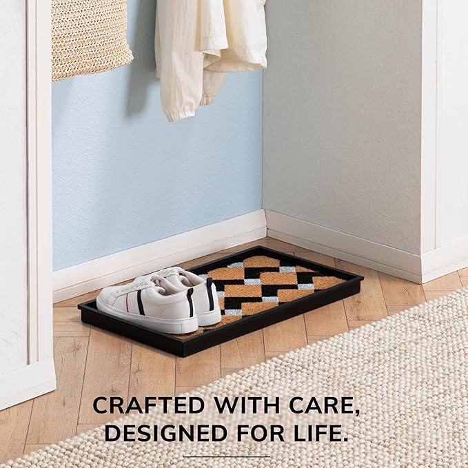 - Made using 100% Woven Coir: This rubber boot tray is meticulously crafted using 100% woven coir (coconut fiber), offering a sustainable and durable solution for your home. The natural fibers of coir are renowned for their toughness and ability to withstand daily wear and tear, ensuring that this boot tray for entryway remains a functional and eco-friendly addition for years to come.