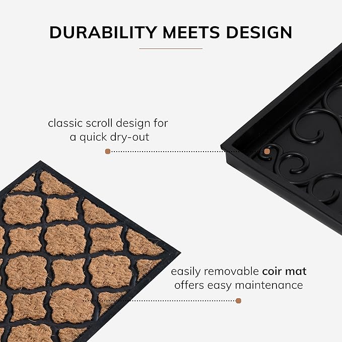- Made using 100% Woven Coir: This rubber boot tray is meticulously crafted using 100% woven coir (coconut fiber), offering a sustainable and durable solution for your home. The natural fibers of coir are renowned for their toughness and ability to withstand daily wear and tear, ensuring that this boot tray for entryway remains a functional and eco-friendly addition for years to come.