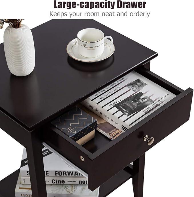 - 〖Ample Storage Space〗Including 1 drawer with a metal handle and 1 lower storage shelf, this 2-tier nightstand is perfect for storing bedside essentials and sundries. Spacious table top allows you to place cups, glasses, family photos, lamps and more. Plus, the drawer is designed for stashing your private items in order.