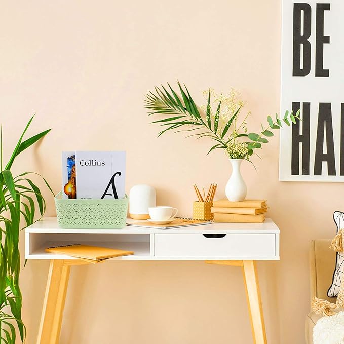 5 Pack Plastic Storage Baskets, Portable Green Fish Scale Pattern Hollow Desktop Storage Bin Box with Handle for Kitchen, Bathroom, Kids Room or Nursery Storage – 9.4 x 7.1 x 4.1 inches