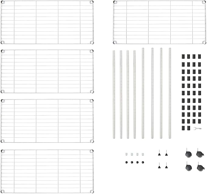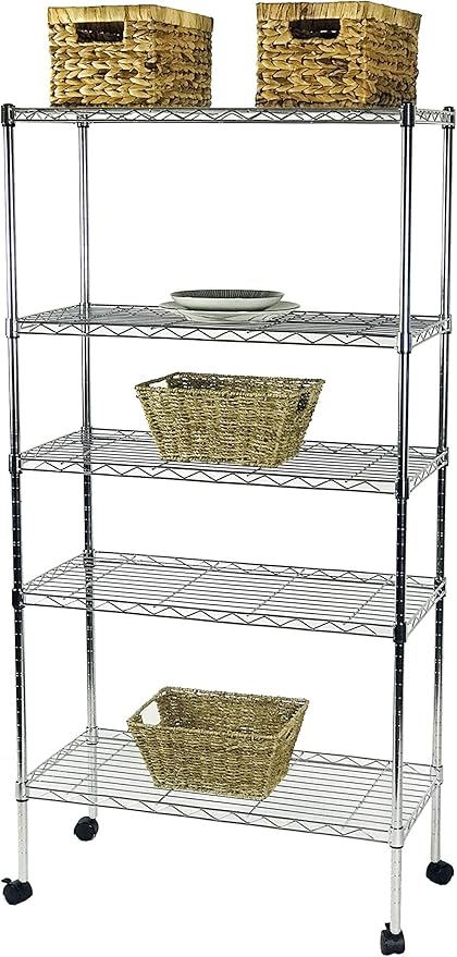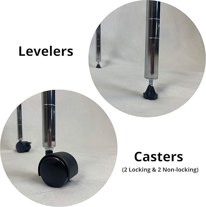 - Our (CHROME FINISH) heavy duty standing wire rack shelving units include 4 rubber casters wheels (2 Locking) for easy mobility as well as 4 leveling wide feet that is perfect for your garage, bedroom, kitchen shelf plans, pantry shelving organization