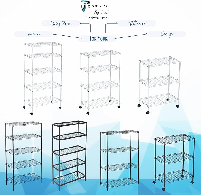 - Displays by Jack's freestanding chrome heavy duty metal 5 tier wire shelving storage racks can be adjustable by 1-inch increments wide.