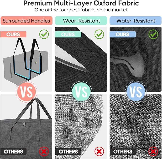 - [✔️ LARGE & PREMIUM MATERIAL]: 23.6'' x 11.8'' x 11.8'' and up to 14 Gallon volume. The totes are made with 900D oxford fabric PVC coated material and premium lining that provides an excellent waterproof performance. The oxford storage tote is an alternative for moving box and organizer. Perfect for space saving, clothes storage, moving, camping and more.