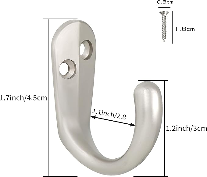 - Size: the clothes hook dimension is 45 x 34 mm or 1.7 x 1.3 inches, screws are 18 mm long and 3 mm in screw head diameter, easy for installation