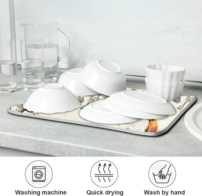 Absorbent Dish Drying Mat Microfiber Dish Drying Pad Reversible Drainer Mats for Countertop, Spring Cute Birds Kitchen Counter Decor, 16'' x18''