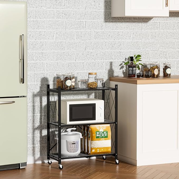 - [Multi-usage Folding Shelf] This metal shelving unit can be used virtually anywhere in the kitchen, living room, office, pantry, garage, laundry and more. Perfects for storing tools, clothes, books, and whatever is taking up space in the home or business.