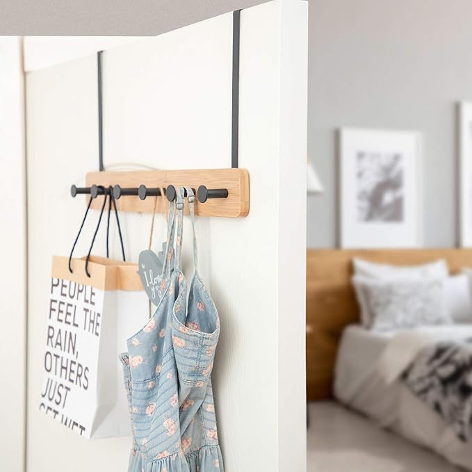 Badiano Over The Door Hook Hanger, Bamboo Coat Rack with 5 Metal Hooks, Wood Clothes Organizer for Coat, Towels, Bags, Robes (Black)