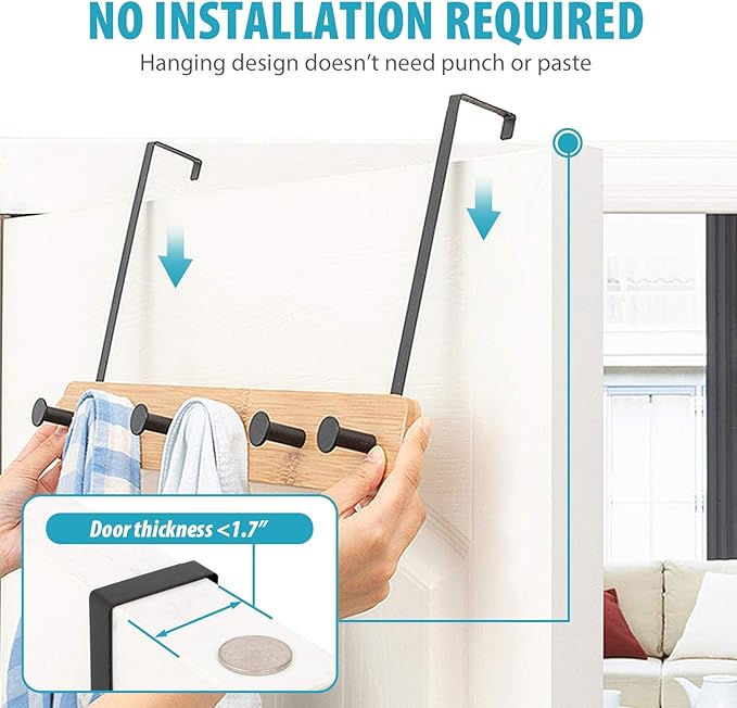 - Easy Installation: Say goodbye to complicated setups! Our door hanger requires no drilling—simply hang it over the door for quick and immediate use. Designed to fit doors up to 1.7 inches thick, just ensure there's a gap of more than 0.08 inches (the thickness of a coin)between the top of the door and the frame
