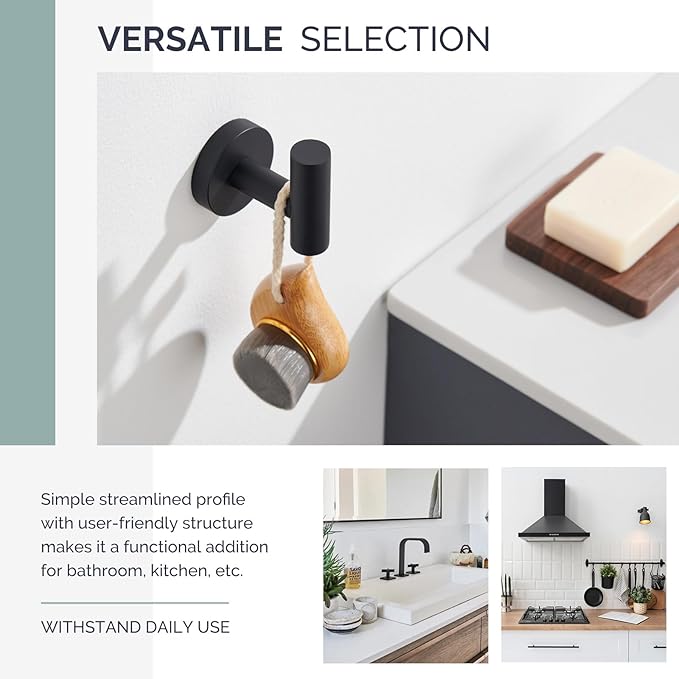 - THOUGHTFUL & CONVENIENT DESIGN: with 1-1/16"(27mm) high of the columnar hook, you could easily hang up robes or towels without falling off, 1-5/16"(34mm) deep of the supporting rod for wider objects, rounded and deburred edges won't tear fabrics, safer for daily organization