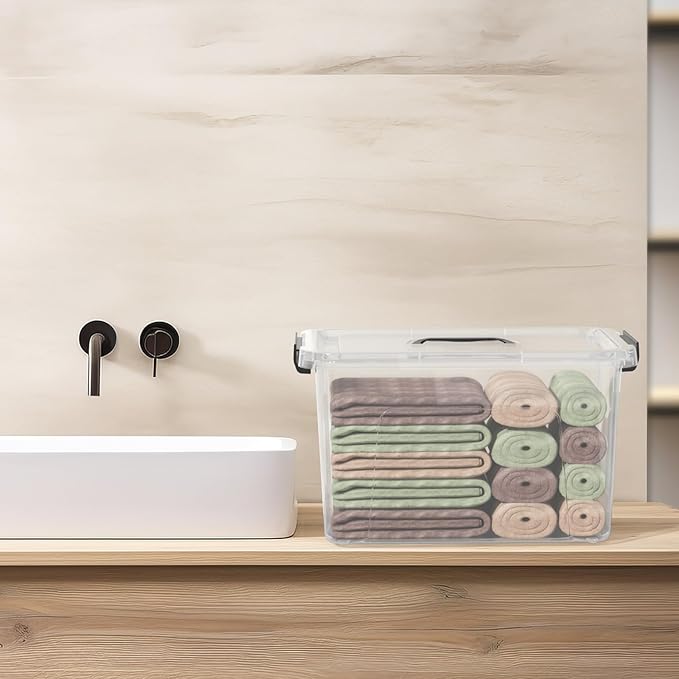 4 Pack 10.5 Quart Plactic Storage Latch Bin, Lidded Box with Black Handle, Clear