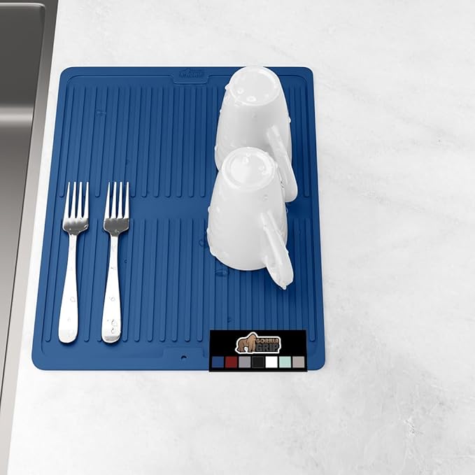 GORILLA GRIP 100% BPA-Free Patented Silicone Dish Drying Mat for Kitchen Counter, Water Catching Ribbed Design, Easy Clean Waterproof Sink Liner, Heat Resistant, Fits Under Rack, 13x11 Inch, Blue
